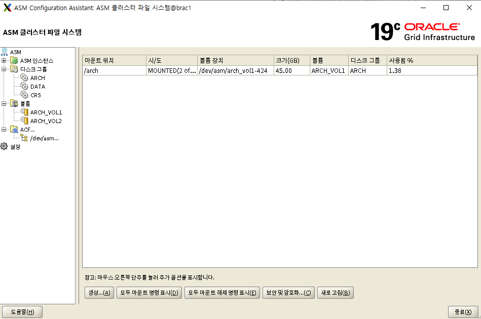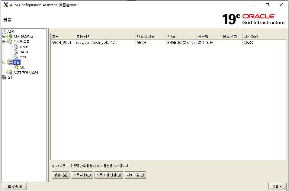 리스타트의 경우 한 번만 dismount $sqlplus / as sysasm SQL> alter diskgroup ARTEST dismount;
